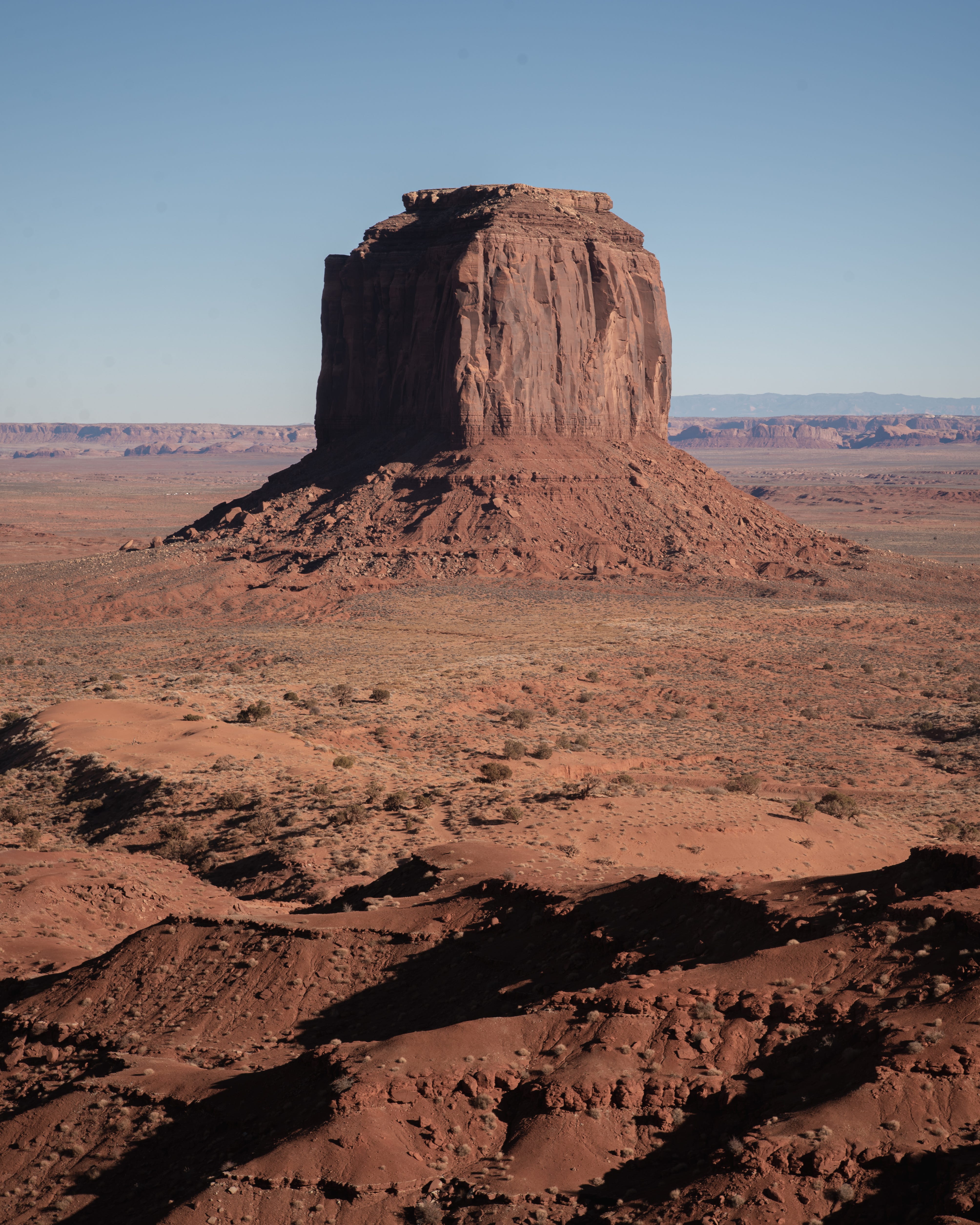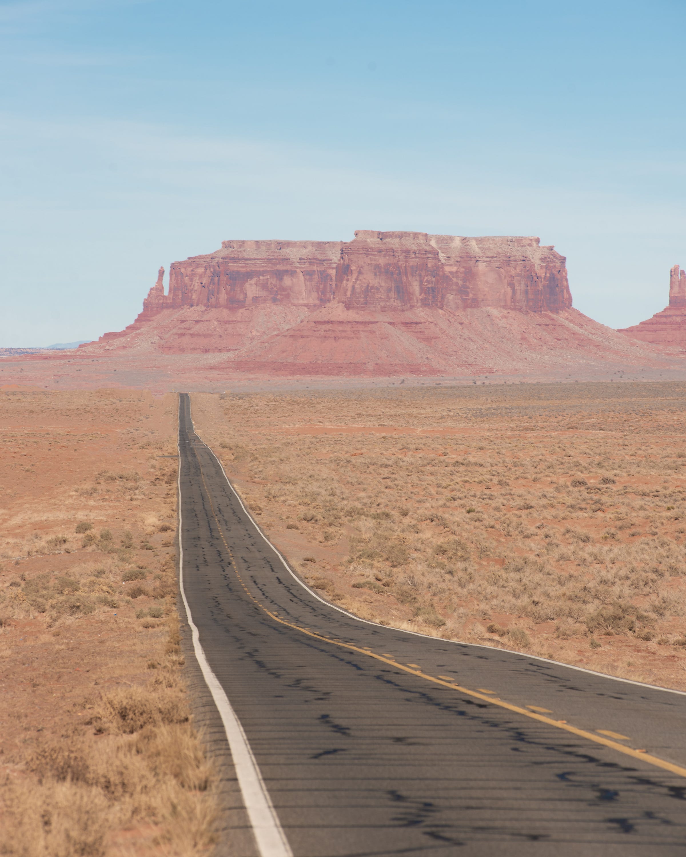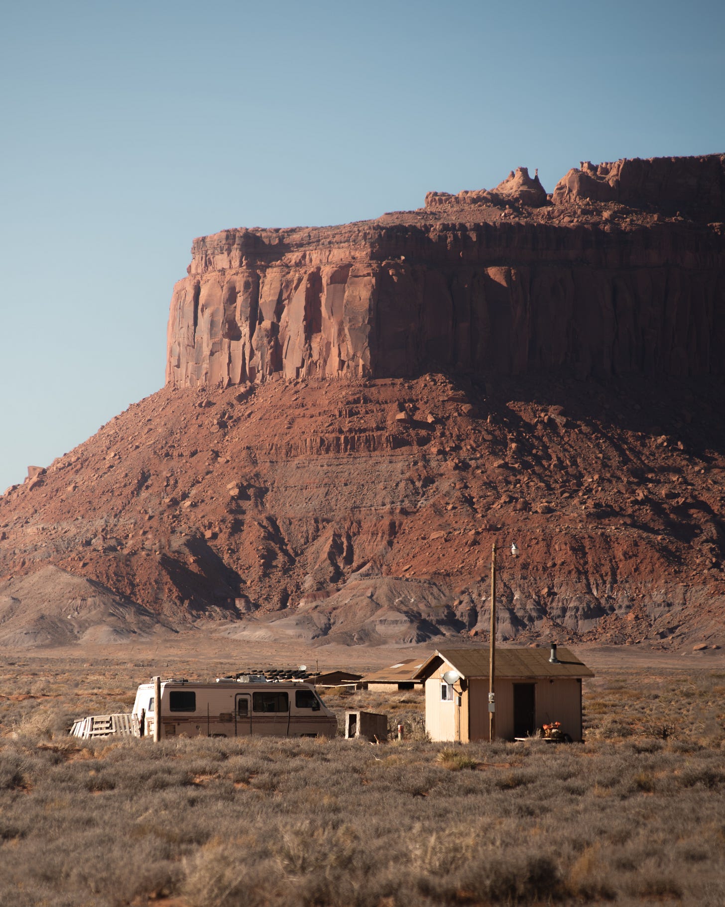 As I drew closer to the iconic Monument Valley, the isolated buttes (basically “small” plateau remnants in the desert) began popping up. I couldn’t help but take photos of any subject I could find for scale since they were so few and far between. It was flat, remote desert and towering rocks. Not a lot going on as far as compositions go beyond the most minimal. The shack and RV in the photo above offered my first real opportunity. The road stretching into Monument Valley proper made it easy for me as well. The lighting was harsh, but the pastel nature of the desert doesn’t mind.