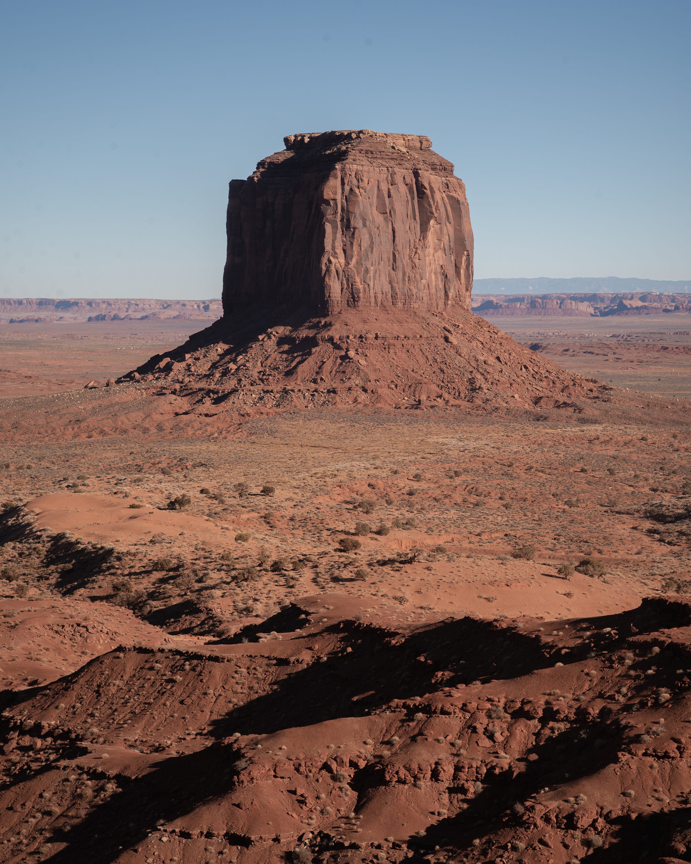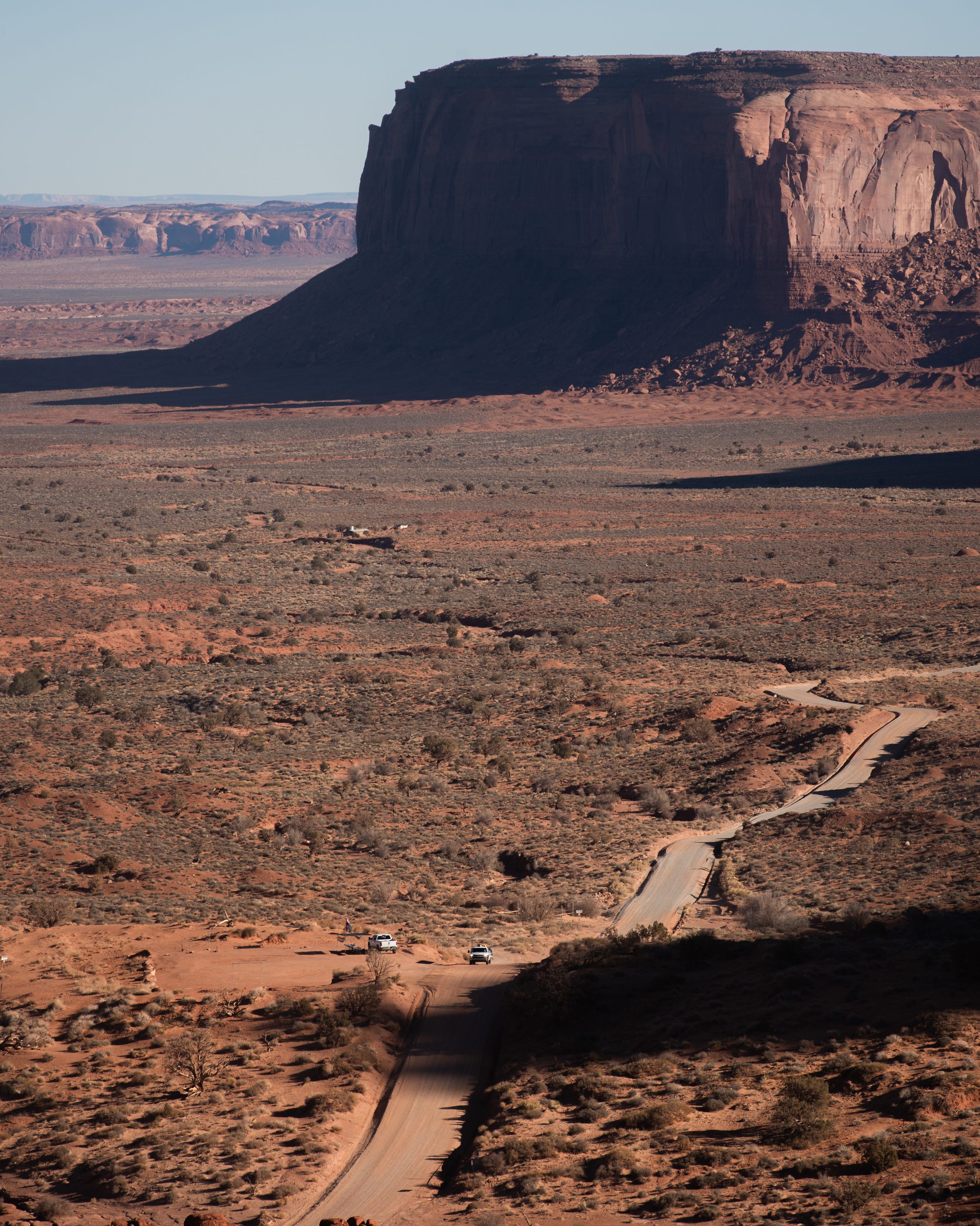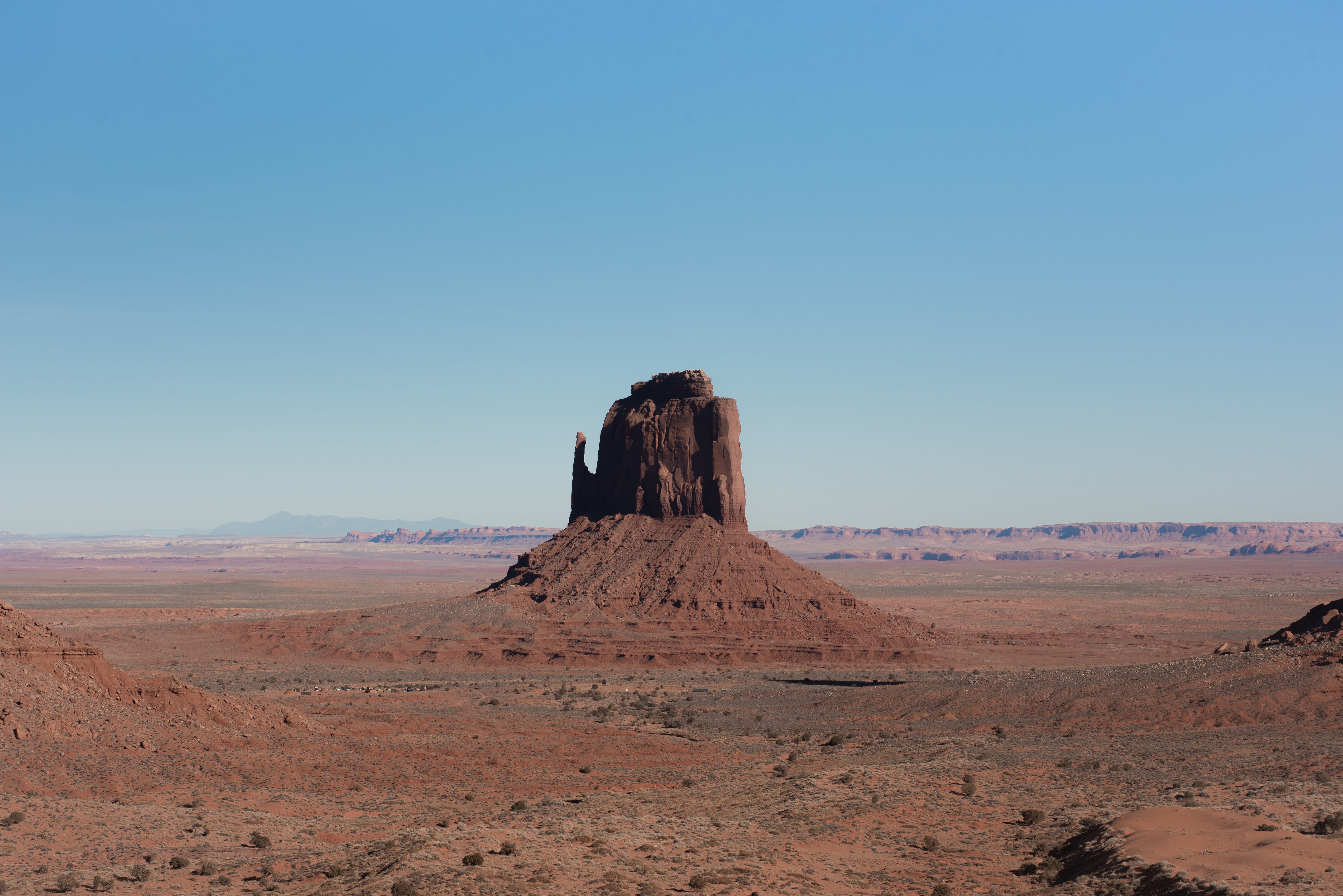 As I drew closer to the iconic Monument Valley, the isolated buttes (basically “small” plateau remnants in the desert) began popping up. I couldn’t help but take photos of any subject I could find for scale since they were so few and far between. It was flat, remote desert and towering rocks. Not a lot going on as far as compositions go beyond the most minimal. The shack and RV in the photo above offered my first real opportunity. The road stretching into Monument Valley proper made it easy for me as well. The lighting was harsh, but the pastel nature of the desert doesn’t mind.