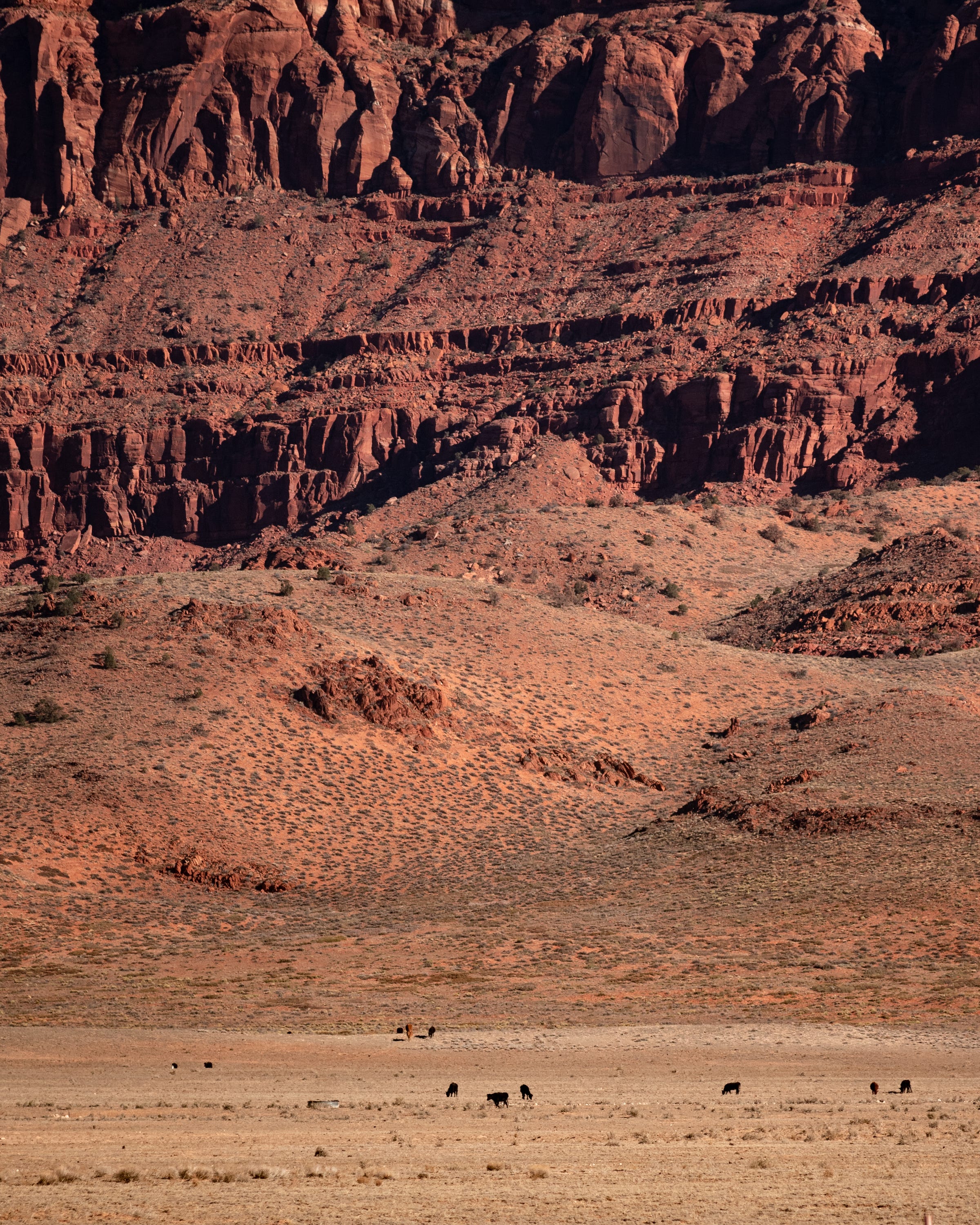 After this viewpoint it was time to head back up to Page. On the way out I actually spotted some bison, which I never expected to see here at all. Apparently, there’s one singular herd that was brought here a long time ago and they just like to chill in the north rim area. It really caught me off guard, and they were far away, so this is the only photo evidence I have. In addition to the bison, I also shot cows once I was out of the national forest. I could actually see the scenery while driving this time and I was blown away by the red walls of the Vermilion Cliffs. The cows were really the only option I had to give some sense of scale.