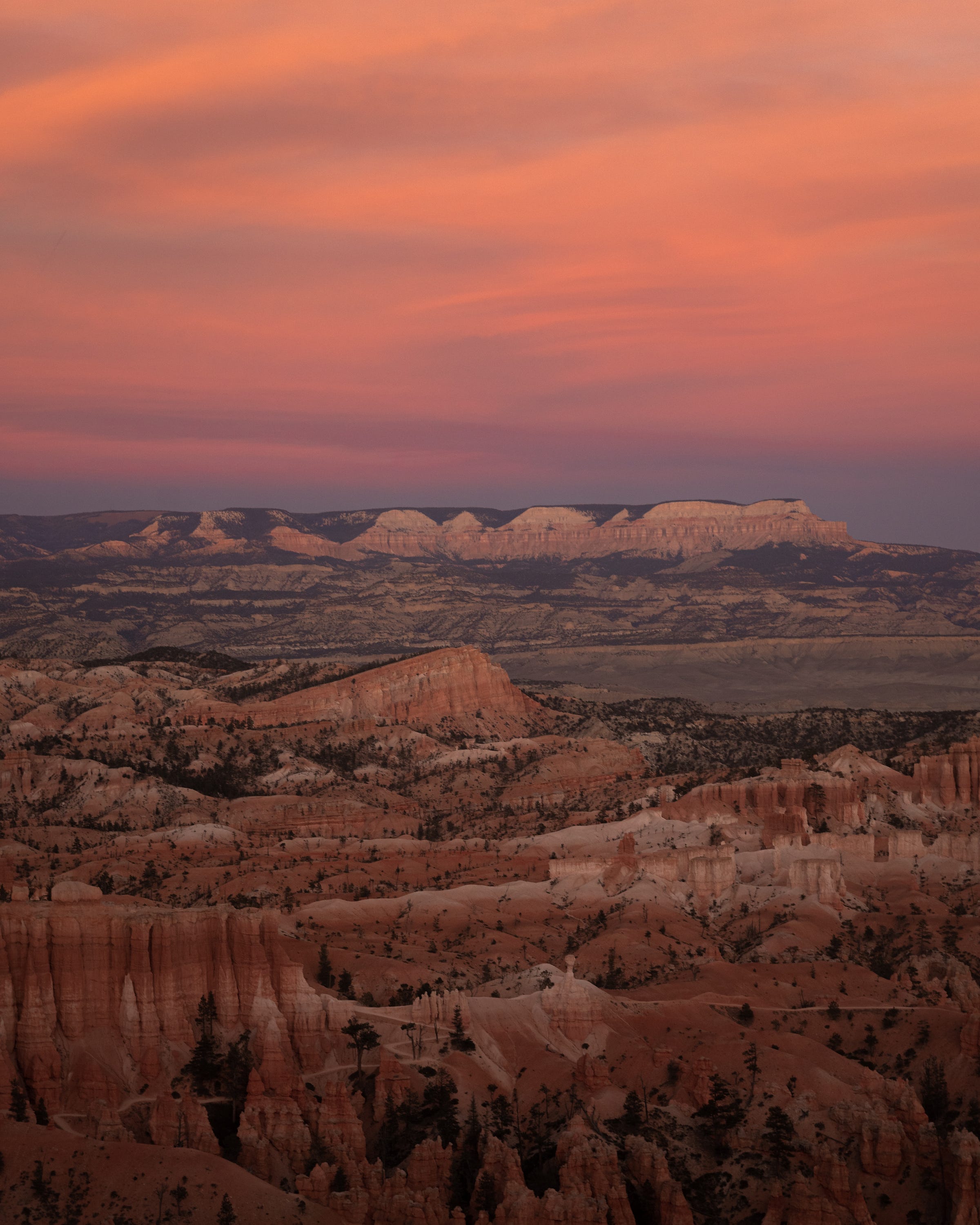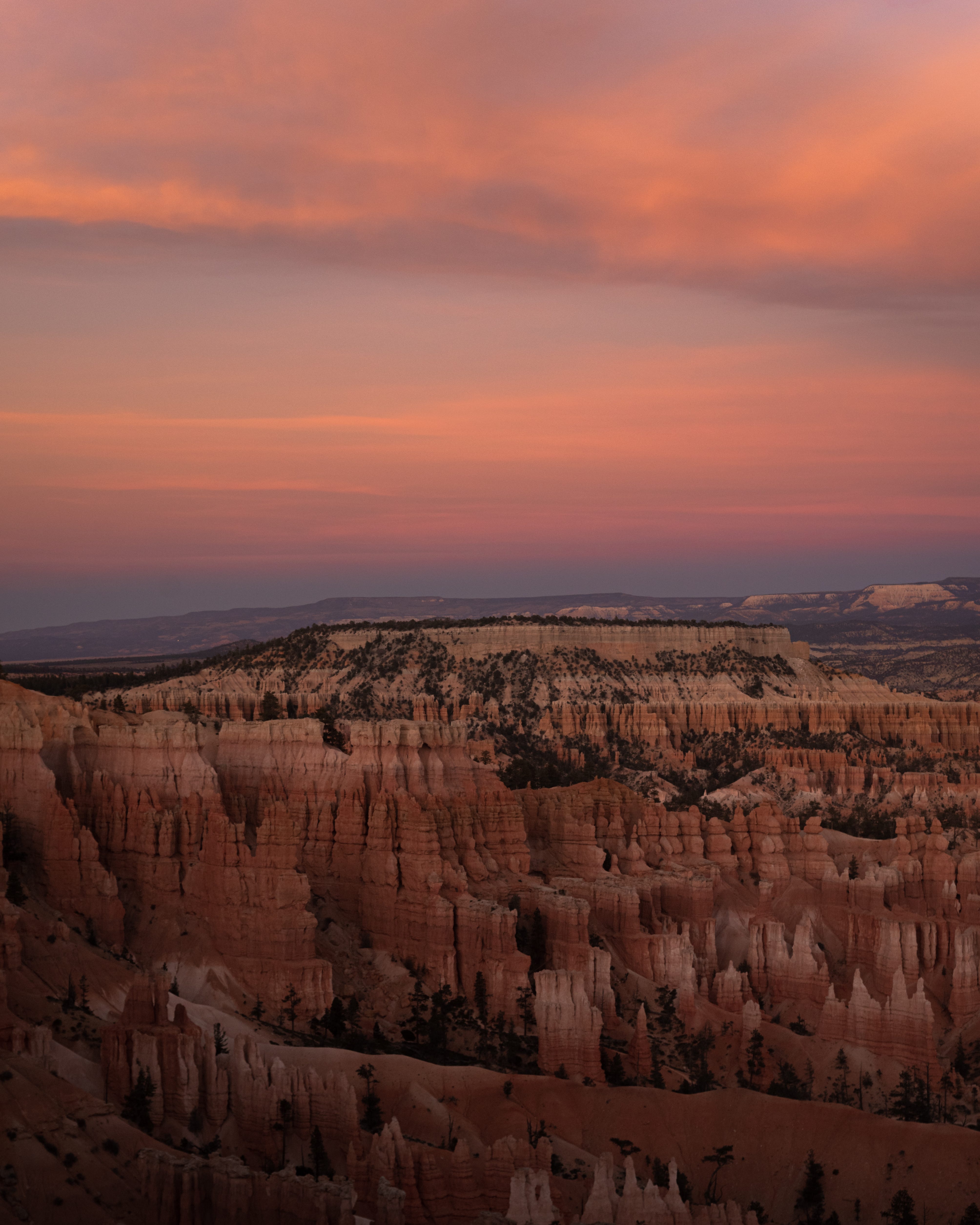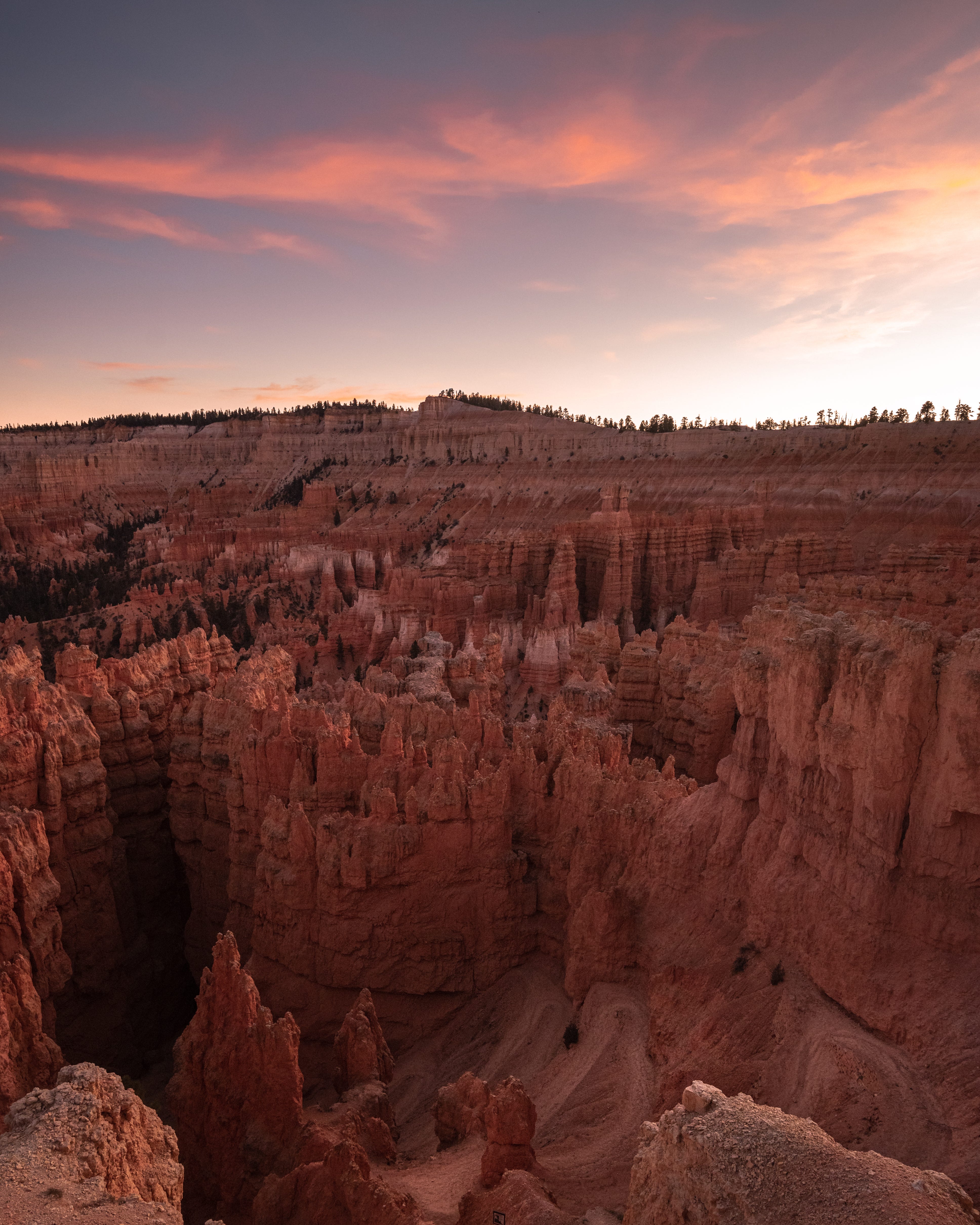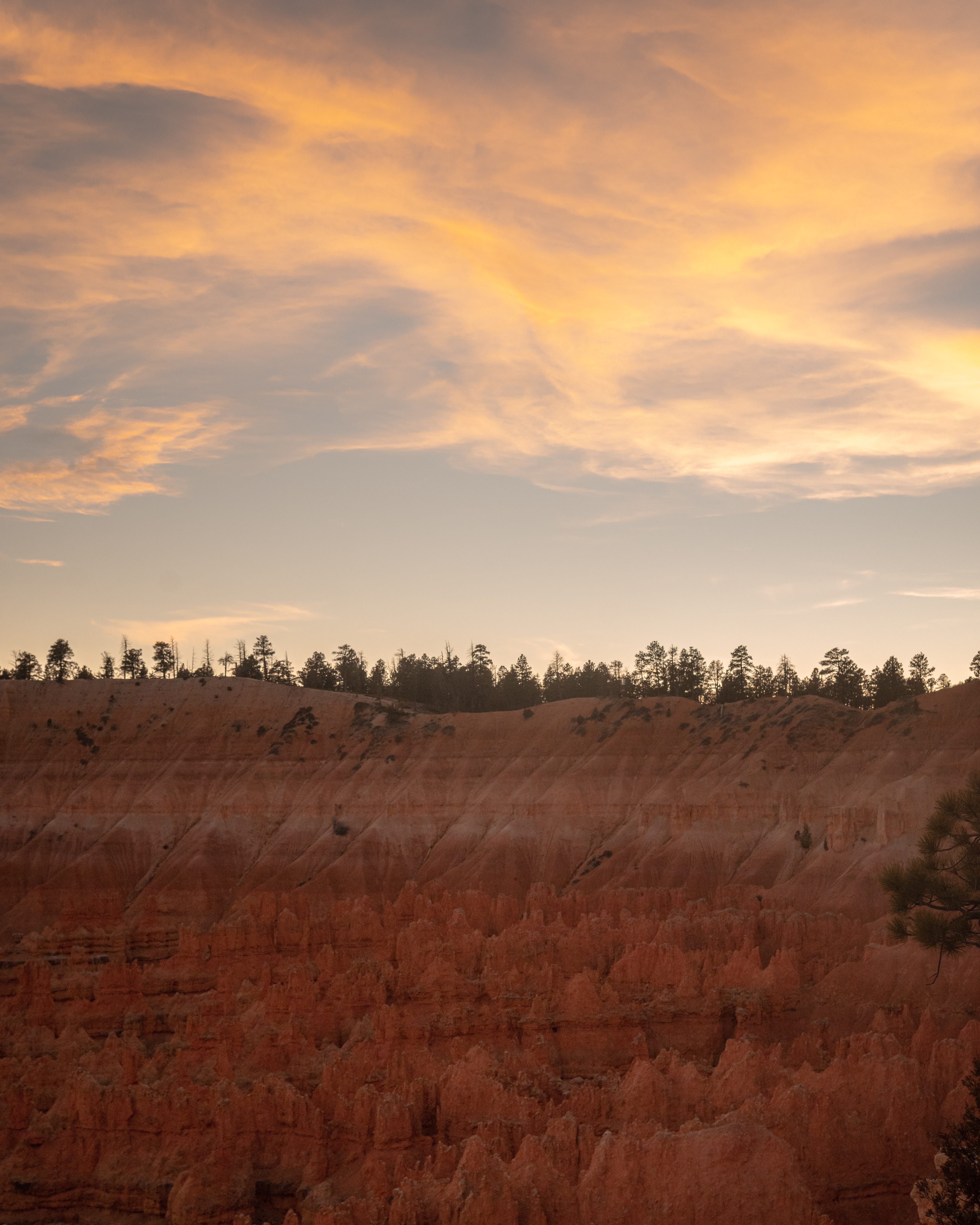 The sun set quick, but thankfully (in this instance) the park is rather small. I was able to drive to the end, hike to rainbow point, and head back to catch the sunset at another overlook closer to the entrance. The photos below show how interesting of a sunset it was, with one thick layer of cloud illuminated.