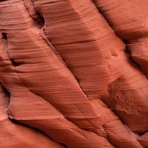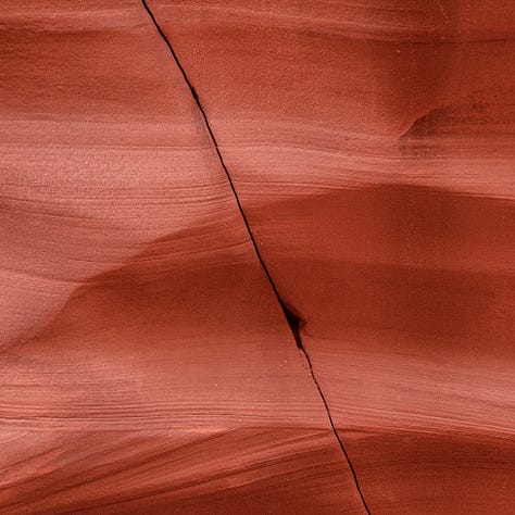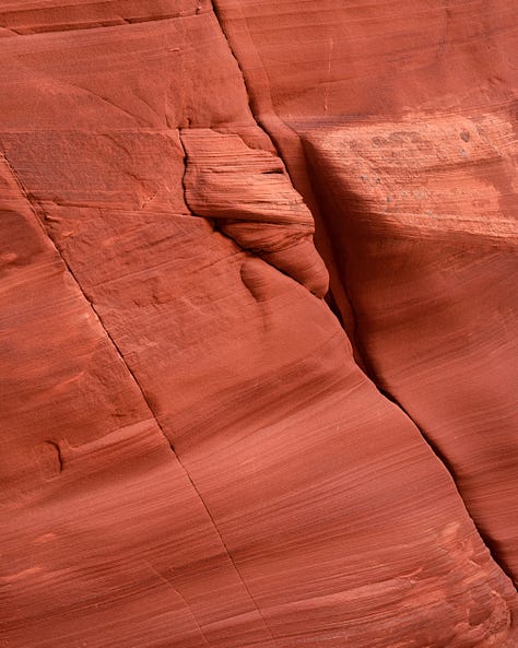 I immediately felt the air get colder and the light turned softer and dimmer as we relied more and more on reflected light. I couldn’t help but notice all of the texture on the walls around me. The main canyon was much more open than what you would think of when picturing a slot canyon, but those stemmed off of the main section. I focused a lot on these textures and tried to find subjects within them when possible. Cracks here were my friend.