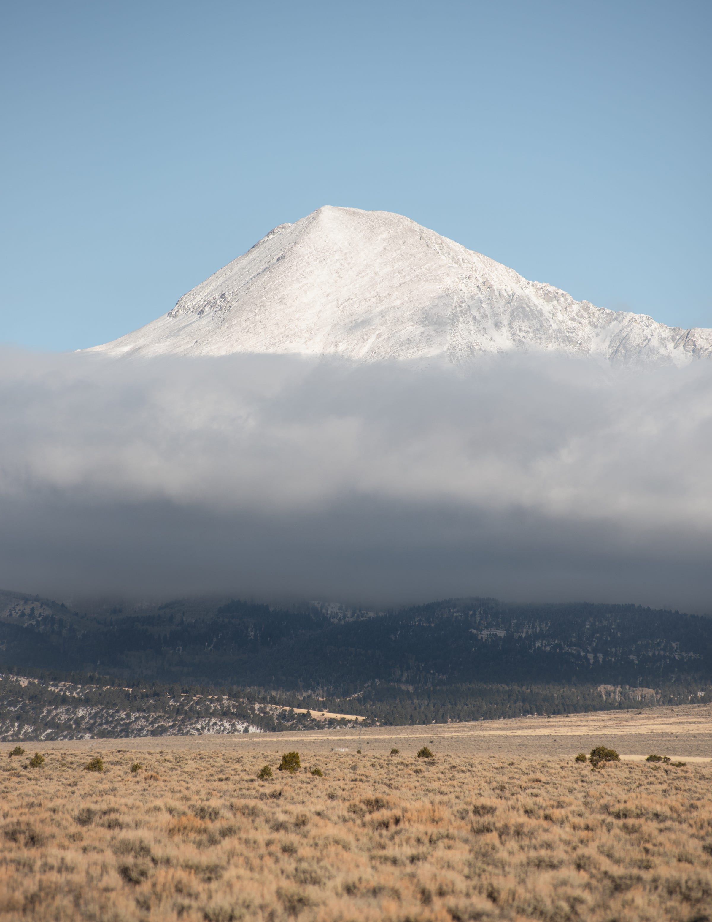 Once officially on the other side of the pass I still had soft light looming and couldn’t help but notice Mt. Lindsey, 14,048 feet tall, looming over the valley through a thick layer of cloud cover at its base. The pastel blue of the sky and yellowed browns of dried grass tufts are always a favorite of mine. The bright top and bottom layer of this photo add a surreal contrast to the gloomy middle layer of dark cloud which ultimately results in an image I very much enjoy, even with its simplicity.
