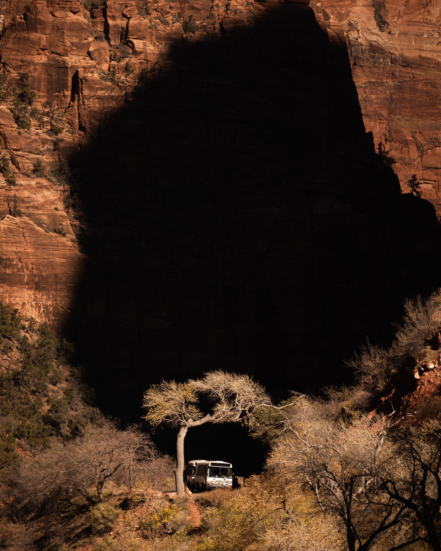 Back down at the bottom of the canyon I embraced the deep shadows and shot the two photos below. In conditions like this where light is harsh, and the shadows are plenty, it’s best to just embrace the contrast. The second photo is a good example of having patience with photography. I knew if I waited long enough a bus would perfectly frame up within the tree, and sure enough it worked out.