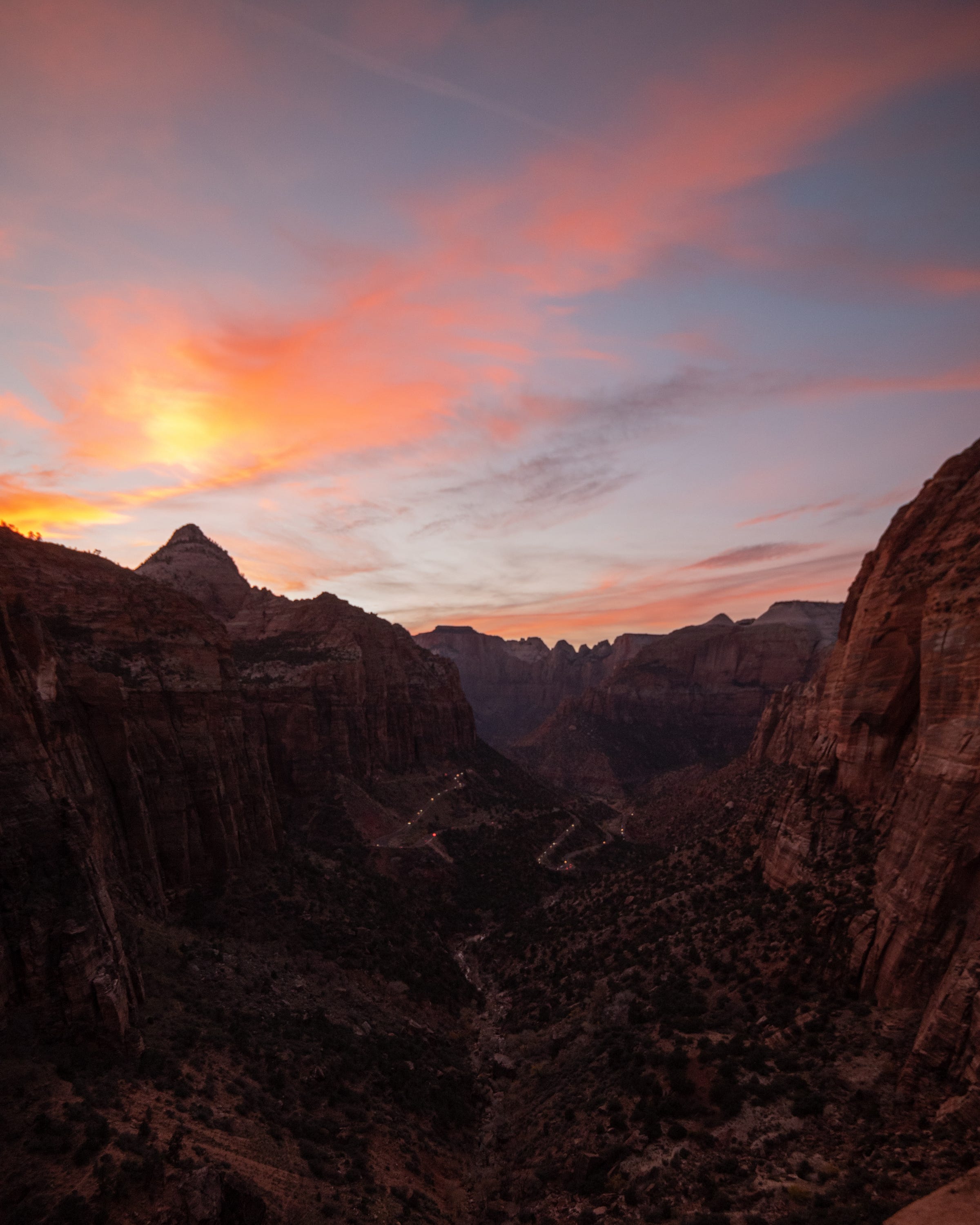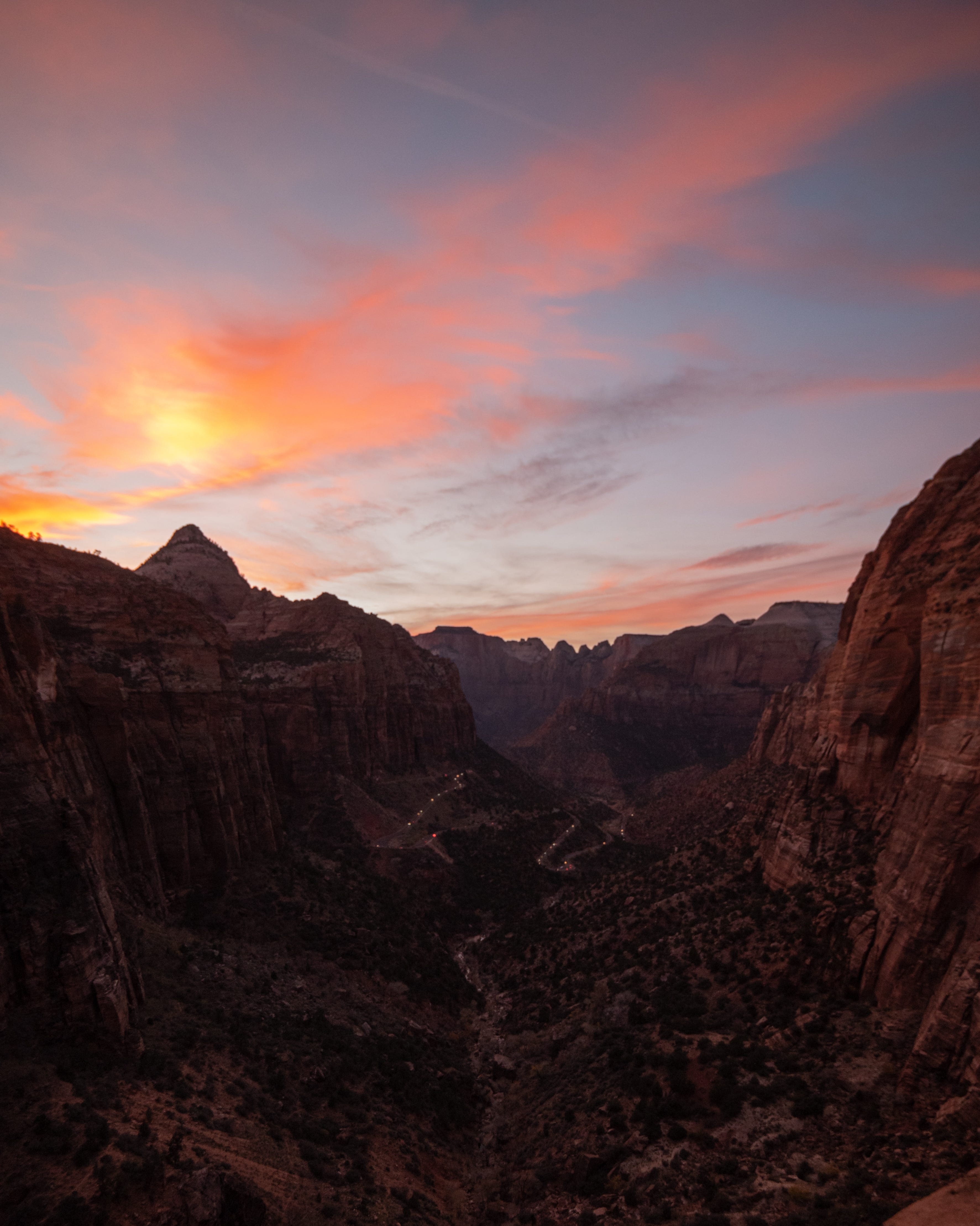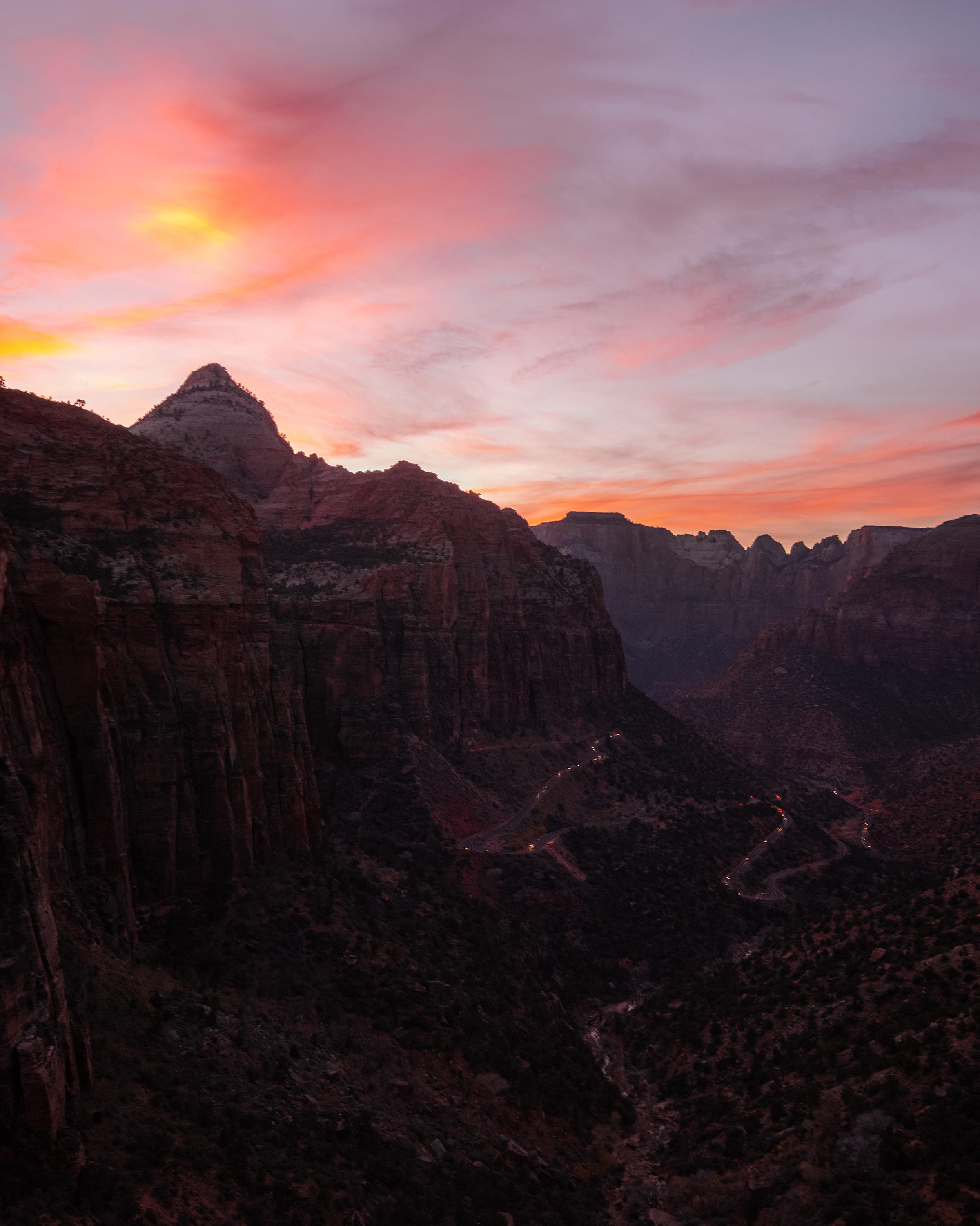 Thankfully, the sunset was a good one, and even though the canyon was dark I still really enjoyed the two photos below. Similarly to Horseshoe Bend, there’s only so many ways one can shoot something like this in these conditions so I just made sure to get the road and the sunset as best as I could. I ended up with two photos, one wider and one a bit more intimate.