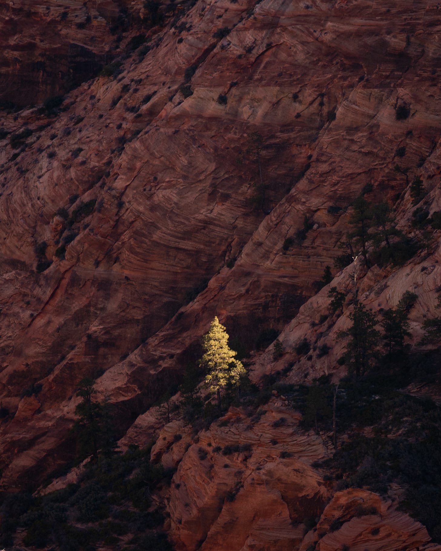 The photo from the top that I enjoy a little bit more is this photo of a lone tree catching the first light to reach the wall. It’s a very minimalist composition, and it only works because of the light. If the whole wall was lit then nothing stands out, and the same goes for if nothing was lit. Timing worked out in my favor and I got lucky with the short window that makes this photo worthwhile.