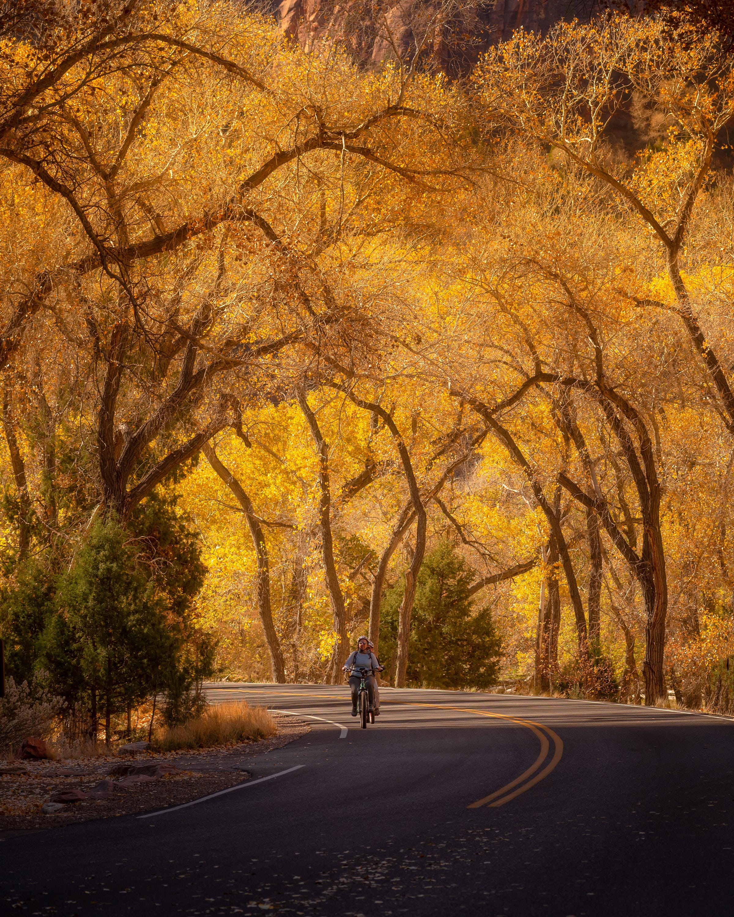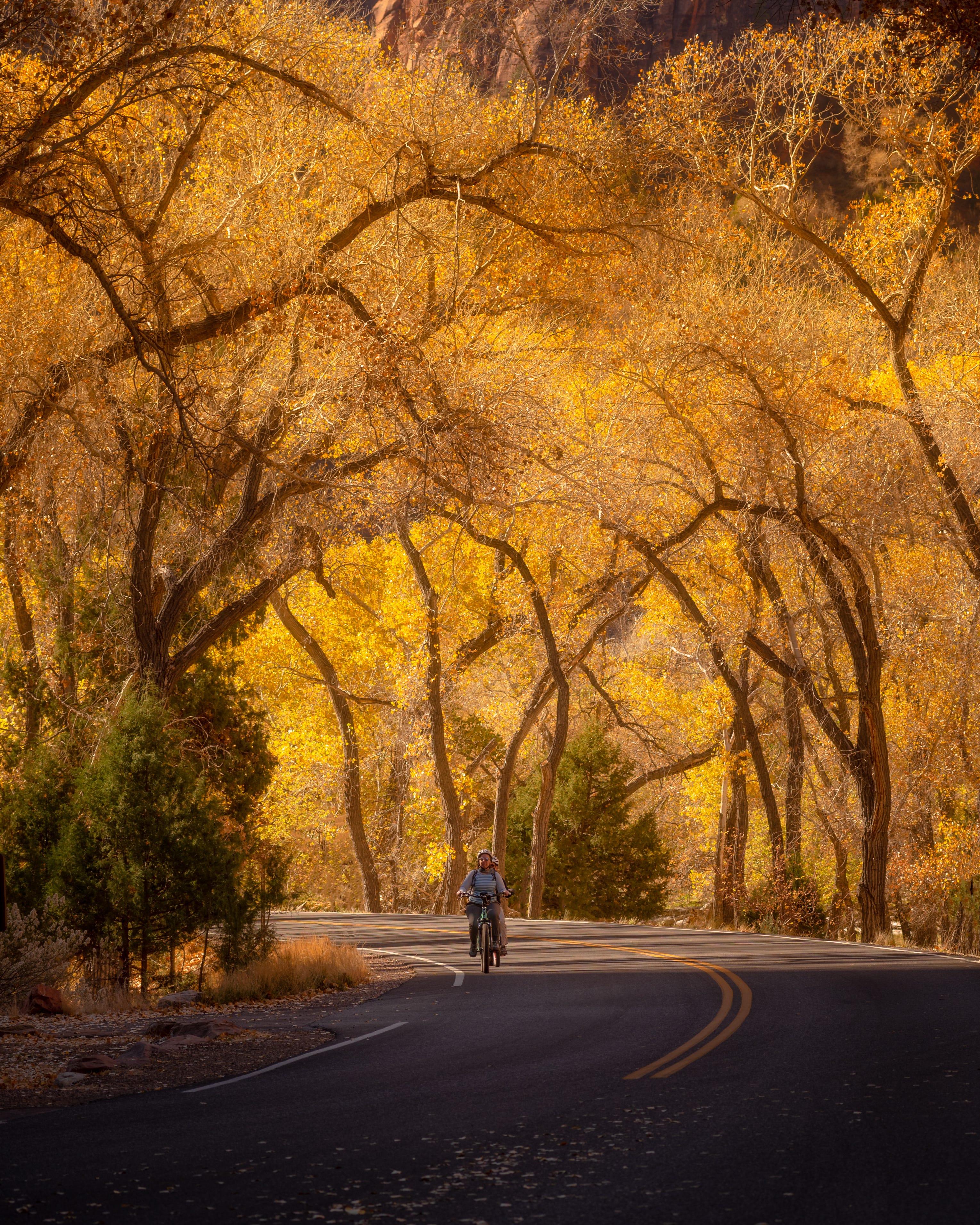 The final shot of Zion I took was of a couple visitors on e-bikes heading through a tree tunnel. The way the light backlit the autumn leaves really made this photo for me. Like I mentioned previously, I didn’t even consider the possibility of fall colors at this time so this photo is a very appreciated surprise. Had the foliage been green I’m not sure I would like this photo as much as I do.