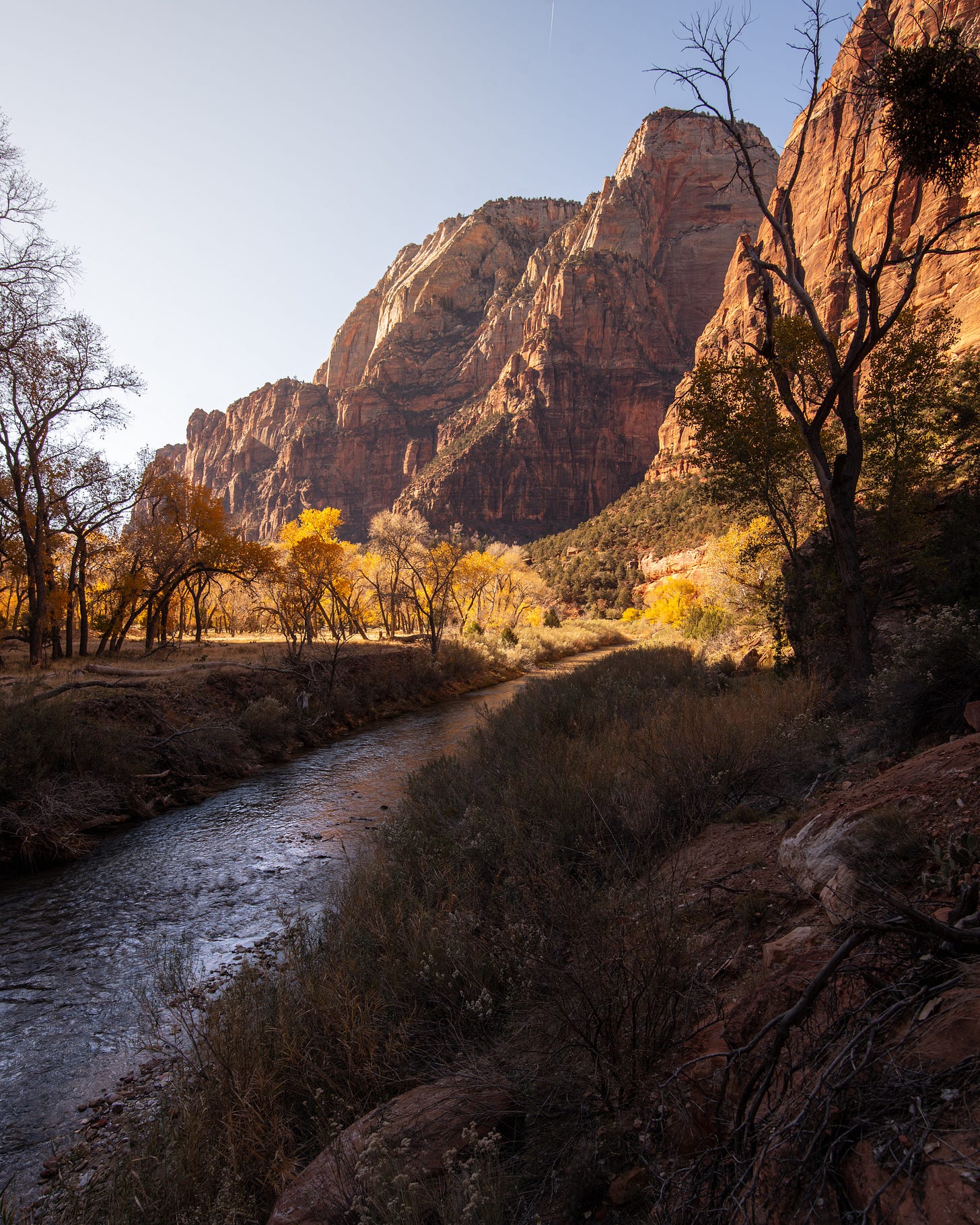 After a few stops I hopped off and shot the photo below of the creek. It’s a simple photo but I’m still fond of it. The fall colors were still lingering in the canyon, which was something I didn’t even consider. This, however, was not the morning’s focus. I was instead heading up Angel’s Landing.